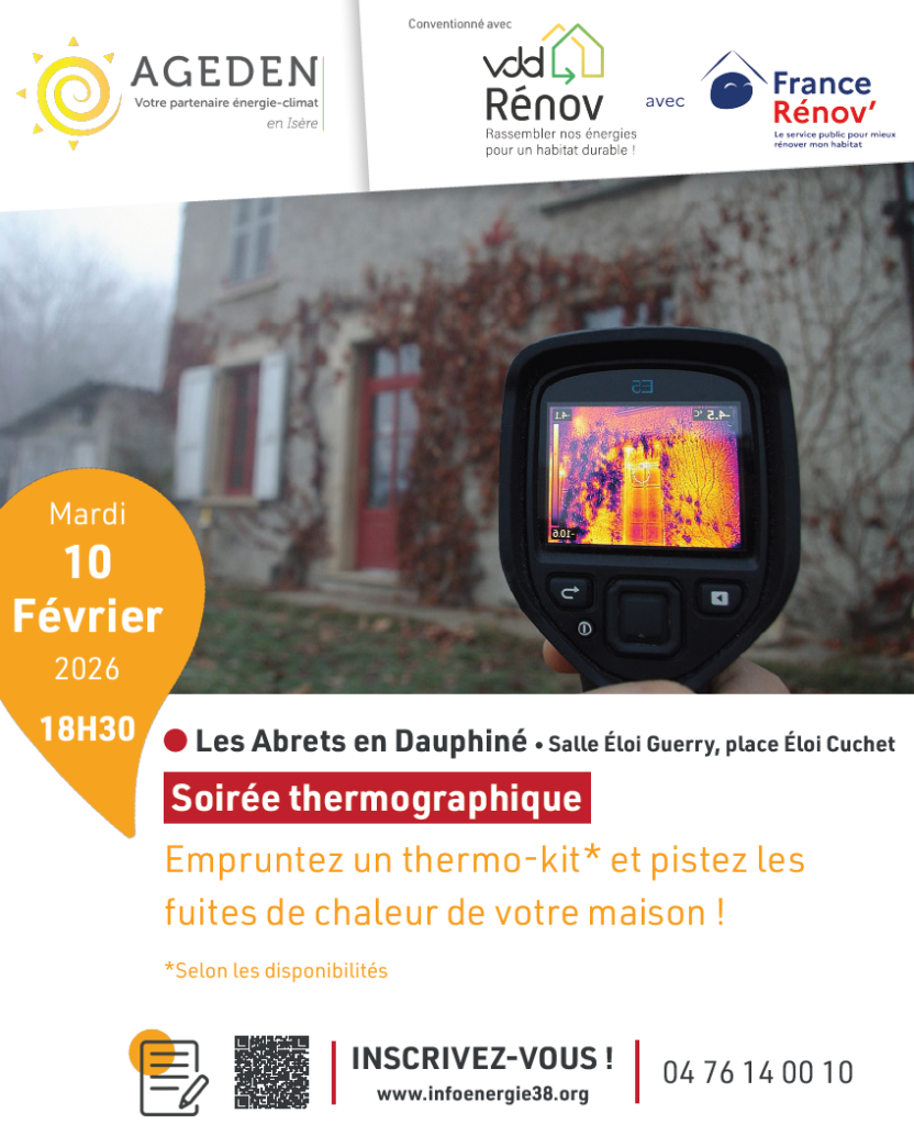 La Communauté de communes des Vals du Dauphiné, en partenariat avec le service Info Énergie de l'Isère - AGEDEN, vous invite à une soirée thermographique le mardi 10 février à 18h30 aux Abrets en Dauphiné. Venez prendre en main une caméra thermique pour identifier les fuites de chaleur et apprendre les bases de l’analyse des images !